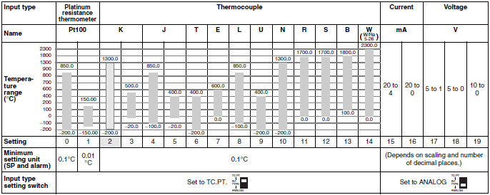 | Sensor input *3 | Thermocouple: K, J, T, E, L, U, N, R, S, B, W Platinum resistance thermometer: Pt100 Current input: 4 to 20 mA DC, 0 to 20 mA DC (including remote SP input) Voltage input: 1 to 5 VDC, 0 to 5 VDC, 0 to 10 VDC (including remote SP input) (Input impedance: 150 Ω for current input, approx. 1 MΩ for voltage input) |